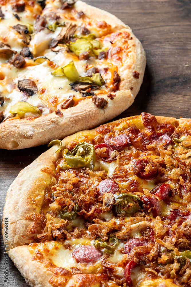 Two delicious pizzas on a wooden surface: one topped with pepperoni, mushrooms, and peppers, and the other with ham, chicken, and olives. Perfect for sharing or a hearty meal.