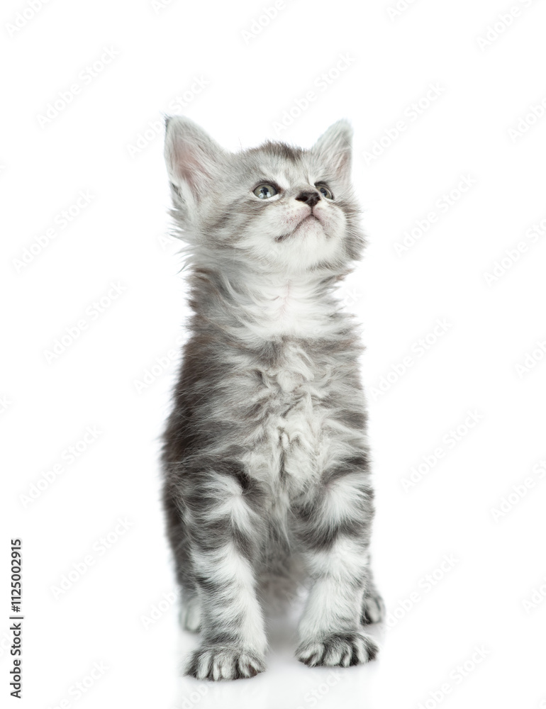 Cute maine coon kitten sitting in front view and looking away and up. isolated on white background