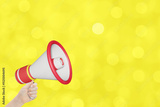 Womans hand holding megaphone on blurred yellow or golden festive background