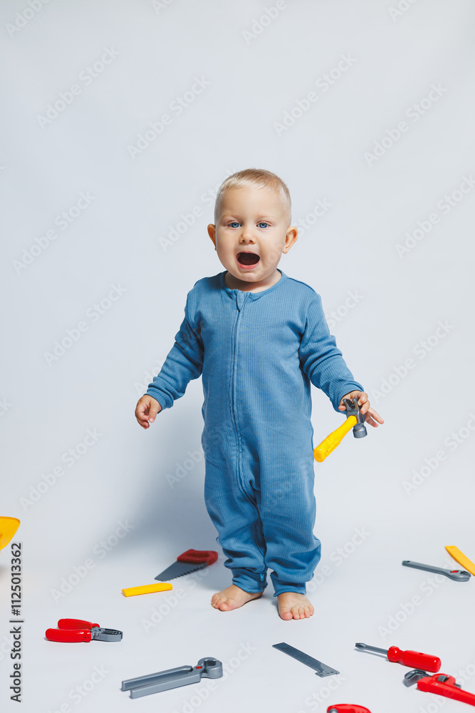 Little boy 1 year old in a cotton romper on a white background playing with plastic toys. Baby playing with a toy hammer.