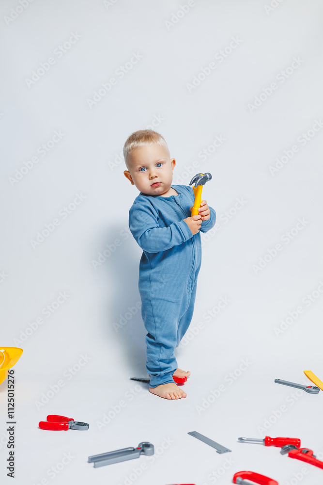 Little boy 1 year old in a cotton romper on a white background playing with plastic toys. Baby playing with a toy hammer.