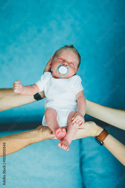 Baby close-up in the hands of mom and dad. Little boy in the arms of parents