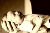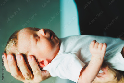 Baby close-up in the hands of mom and dad. Little boy in the arms of parents