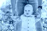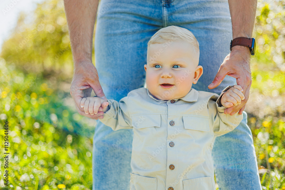 Little boy learning to walk holding hands with mom and dad. Child taking first steps.