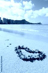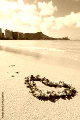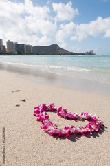 orchid flower garland necklace in love heart shape on white sand beach, romantic couple honeymoon trip at Hawaii