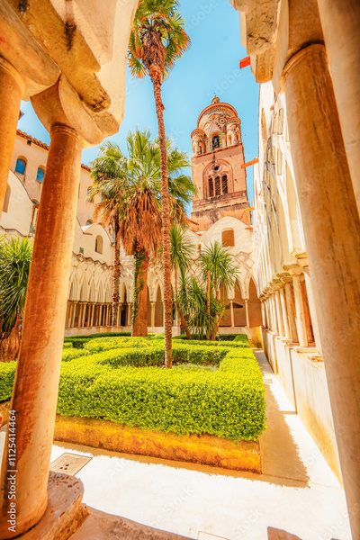 Amalfi Cathedral bell tower in Amalfi coast in Italy. The church of the Apostle Saint Andrew in the Piazza del Duomo in amalfi city