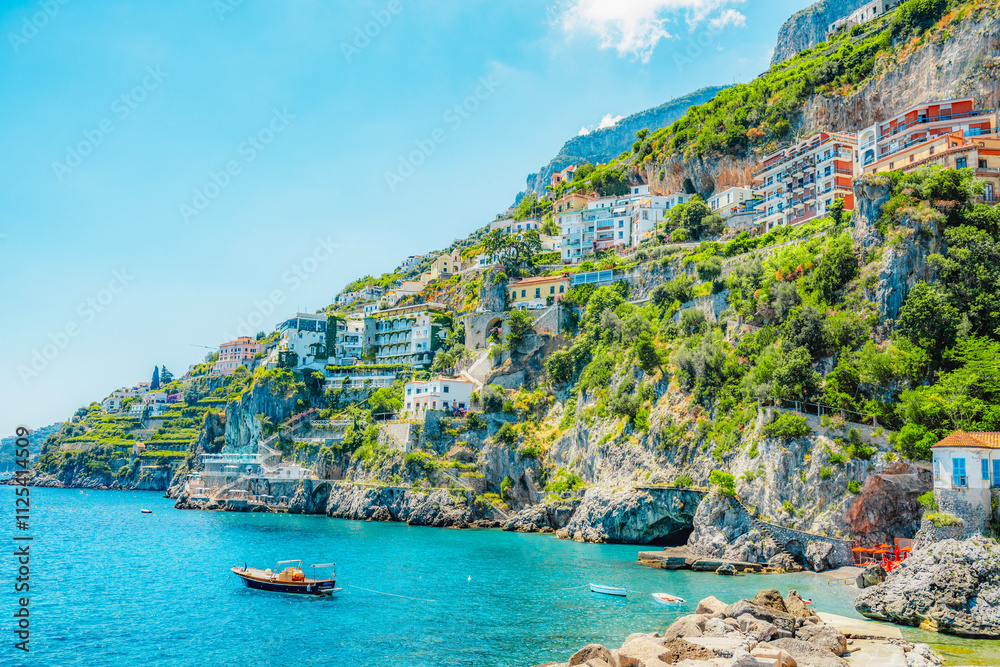 Amalfi coastline in southern Italy, vertiginous cliffs adorned with colorful villages, turquoise waters. Town Amalfi on Amalfi Coast in province of Salerno, Campania region, Italy