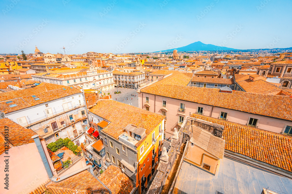 View fom Chiesa della Badia di Sant'Agata on Cathedral Sant Agata on Piazza del Duomo with Elephant Fountain. in Catania, Sicily, Italy.