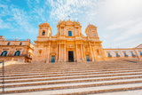 view in Noto, with the Basilica Minore di San Nicolo and Palazzo Ducezio, Sicily, Italy.