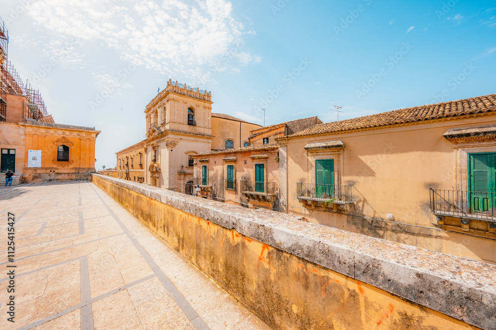 view in Noto, with the Basilica Minore di San Nicolo and Palazzo Ducezio, Sicily, Italy.
