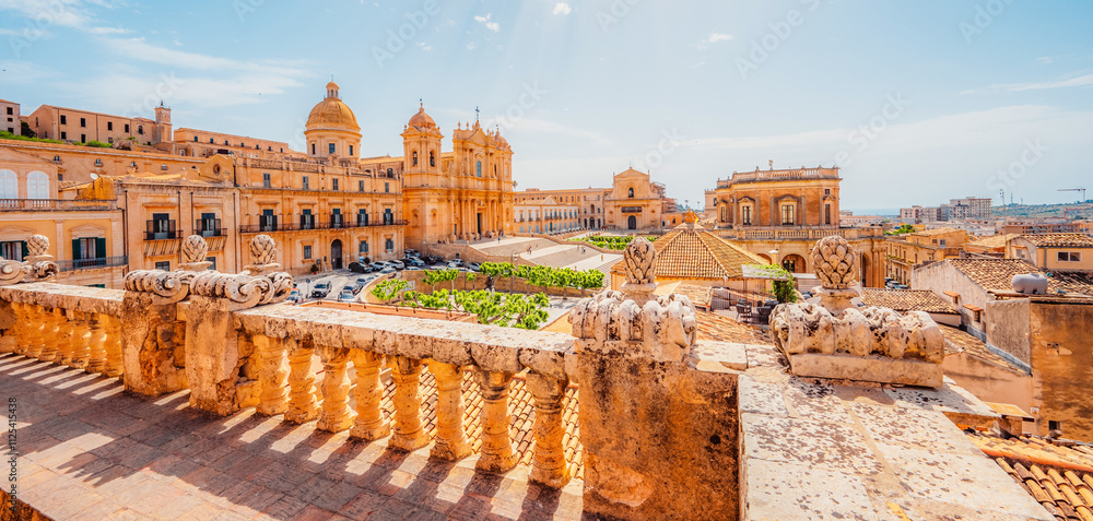 view in Noto, with the Basilica Minore di San Nicolo and Palazzo Ducezio, Sicily, Italy. Chiesa di San Carlo al Corso.
