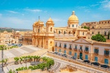view in Noto, with the Basilica Minore di San Nicolo and Palazzo Ducezio, Sicily, Italy. Chiesa di Santa Chiara.