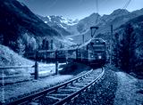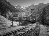 Red modern electric train traveling along a railway, winding through a stunning high mountains with snow-capped peaks and vibrant autumn trees in switzerland. Bernina Express in fall. Railway tourism