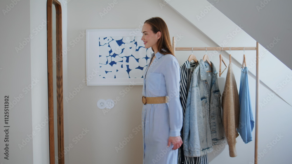 Happy girl choosing dress looking reflection at home. Lady thinking what to wear