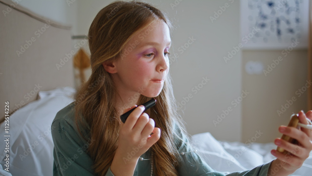 Small girl using makeup in mothers room closeup. Little kid putting lipstick