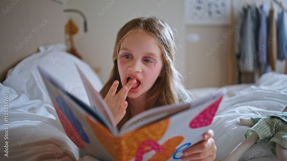 Makeup child reading fairytale relaxing on blanket closeup. Small kid lying