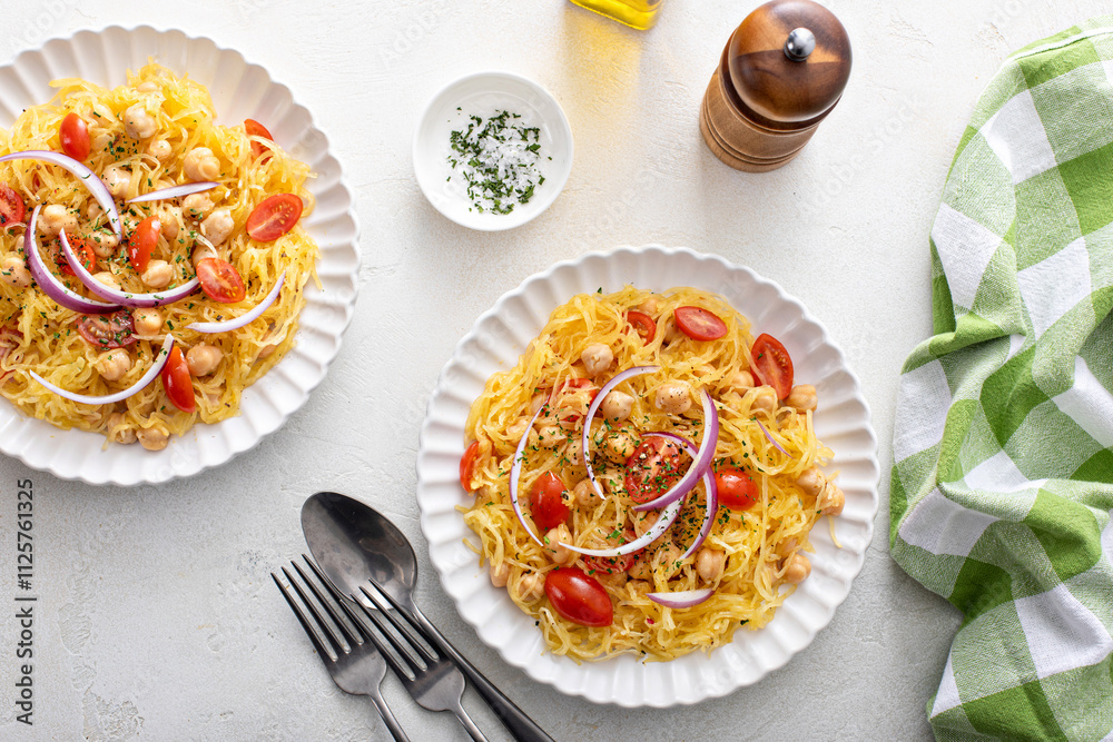 Spaghetti squash with chickpeas and tomatoes topped with red onion, low carb vegan recipe idea