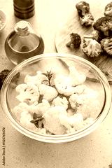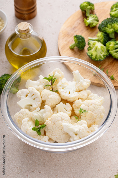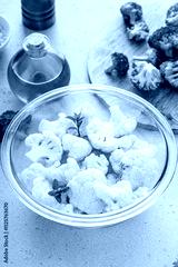 Bowl of cauliflower with broccoli, ready to be roasted, cooking with vegetables