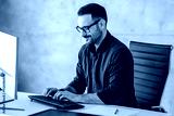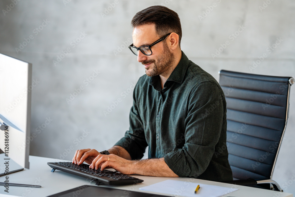 Happy professional business man company employee, young entrepreneur, smiling businessman working
