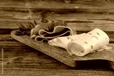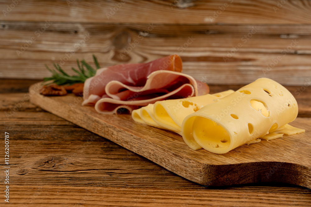 Cheese plate with prosciutto, jamon cut, parma ham, serrano slices, cured iberico closeup, cheese board