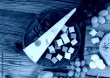 Cheese plate of color cheeses variety, yellow, white and blue cheese board, assorted dairy products