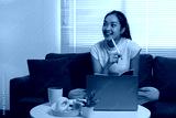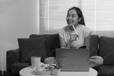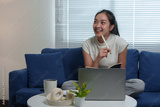 Attractive young Asian woman uses laptop computer to learn how to run an online business, take notes, social media learning, thinking skills, designing while sitting on a sofa in her living room.