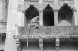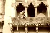 Decorated balcony in Jaleb Chowk - main courtyard of Amber Fort, Rajasthan, India