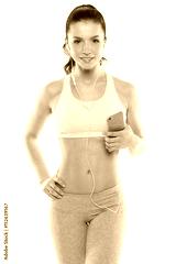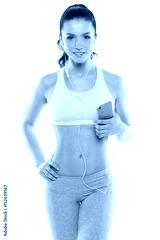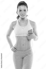 fitness girl with a smartphone on a white background, enjoys sports training, gym workout