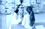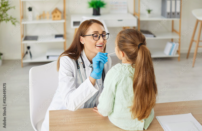 Female smiling pediatrician examining little girl patient's throat in modern medical clinic on workplace. Doctor woman otolaryngologist exam the oral cavity of sick child in office. Medicine concept.