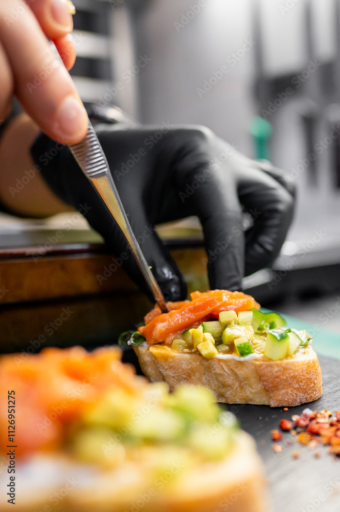 A close-up of a chef's hand in a black glove delicately placing slices of salmon on a colorful bruschetta topped with fresh vegetables and herbs on a dark surface.
