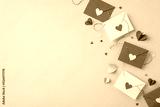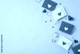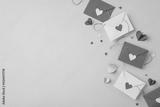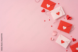 Top view of a romantic arrangement of red and pink envelopes with heart accents on a soft pink background, symbolizing love and affection