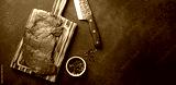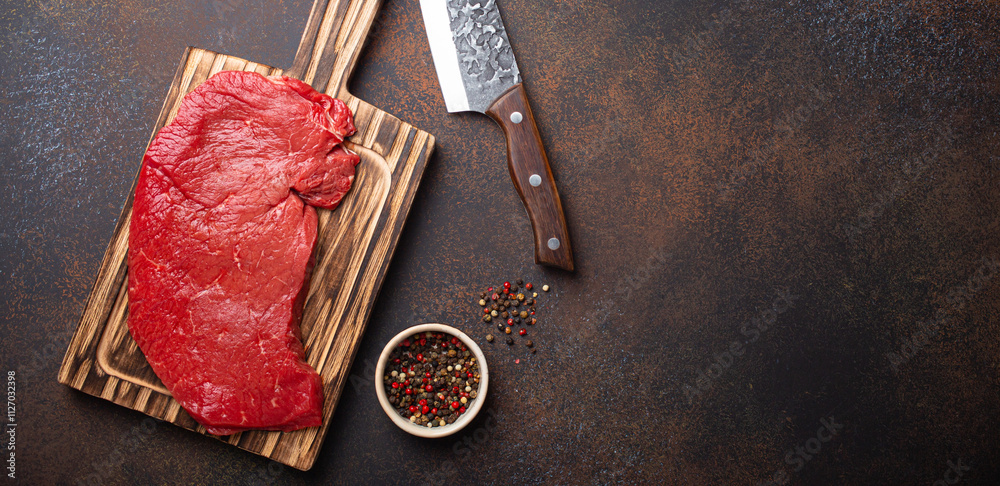 Raw uncooked top round beef steak on wooden cutting board with big kitchen knife and pepper on dark brown rustic stone background top view, cooking meat steak with copy space