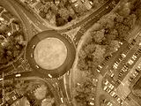 Aerial view of a typical, large roundabout in Britain. Seen close to a large supermarket and retail park in East Anglia.