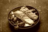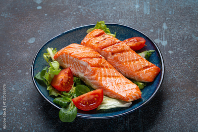 Grilled fish salmon steak with vegetables salad on ceramic plate on rustic stone background angle view, balanced diet or healthy nutrition salad meal with salmon and veggies
