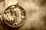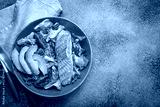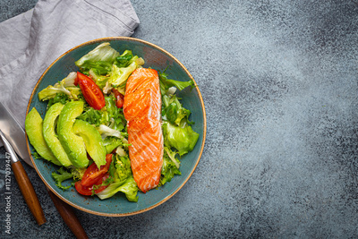 Grilled fish salmon steak and vegetables salad with avocado on ceramic plate on rustic stone background top view, balanced diet or healthy nutrition salad meal with salmon and veggies, space for text