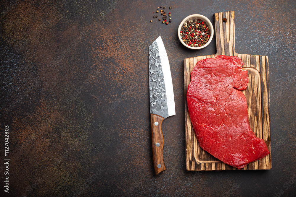 Raw uncooked top round beef steak on wooden cutting board with big kitchen knife and pepper on dark brown rustic stone background top view, cooking meat steak with copy space