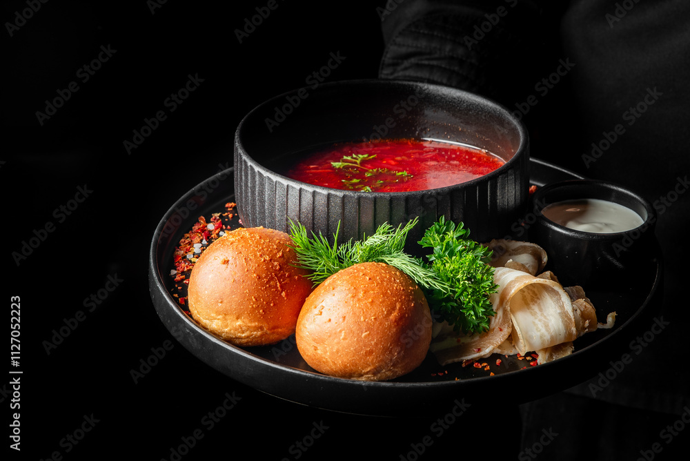 A beautifully plated dish featuring rich red soup in a textured black bowl, accompanied by two golden bread rolls, fresh herbs, and garnished with thin slices of bacon and a small bowl of cream