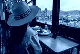 Latin tourist having lunch and looking at the Cusco square from the window