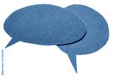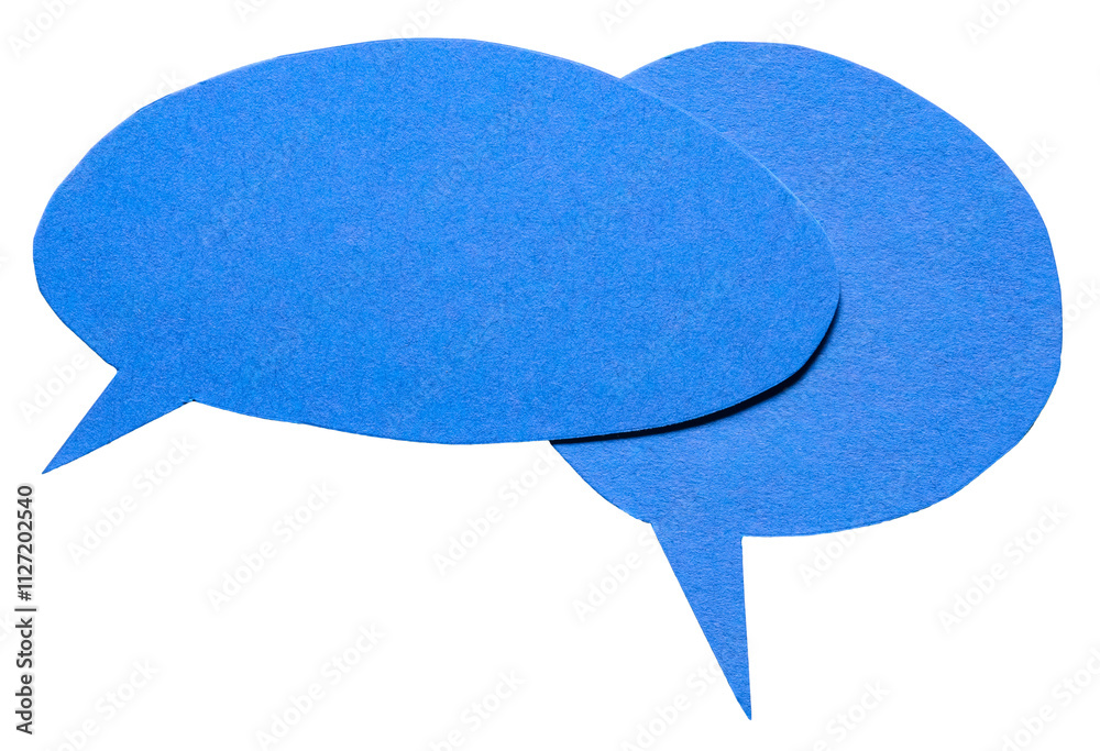 Two blue blank cut out cardboard paper speech bubbles with rough edges and copy space for text on transparent png background design element