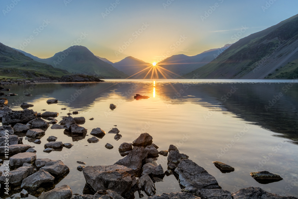 Peaceful view of Wastwater in the Lake District as the sun rises through mountains.