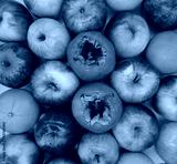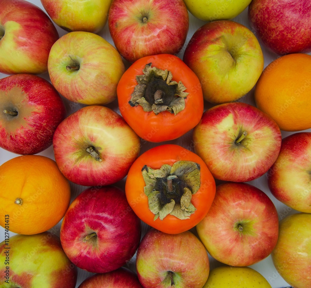two persimmon fruits on a background of apples and oranges