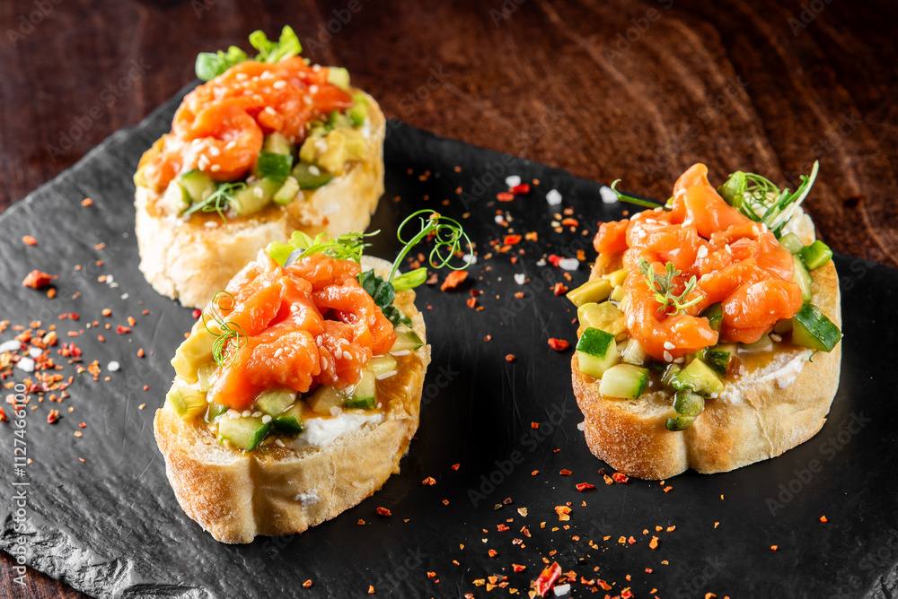Three delicious bruschetta topped with salmon and fresh vegetables, served on a black slate plate. A gourmet appetizer perfect for any occasion, showcasing vibrant colors and textures.