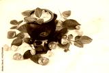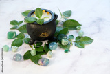 gemstone crystals, leaves and witch Ouija Cauldron Pot on marble table close up. occult esoteric ceremony, witchcraft. Magic Crystal Ritual. spiritual practice for relax, meditation, life balance.
