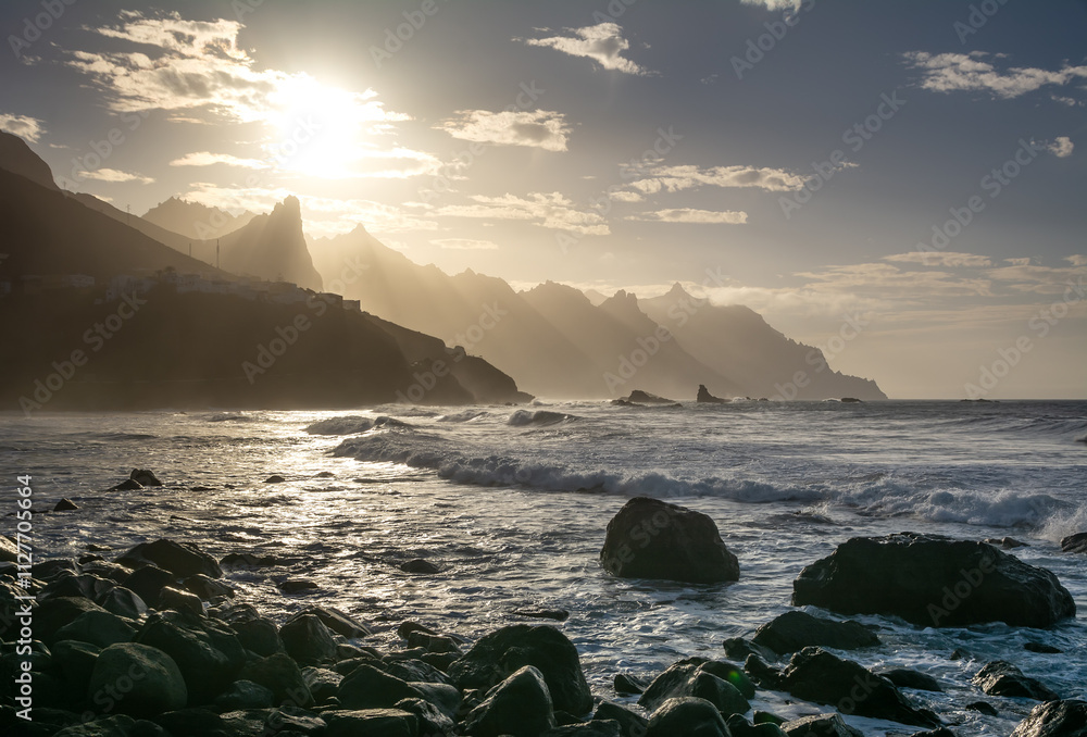 Amazing nature view of Benijo beach during a beautiful sunset. Location: Anaga, Almaciga, Tenerife, Canary Islands. Artistic picture. Beauty world.