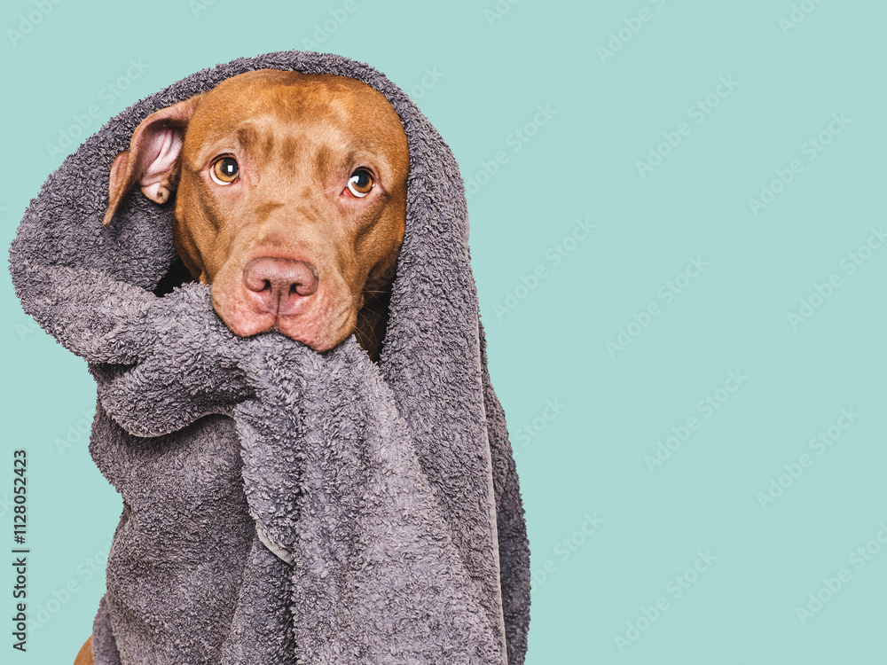 Cute dog and blue towel. Grooming dog. Close-up, indoors. Studio shot. Concept of care, education, obedience training and raising pets
