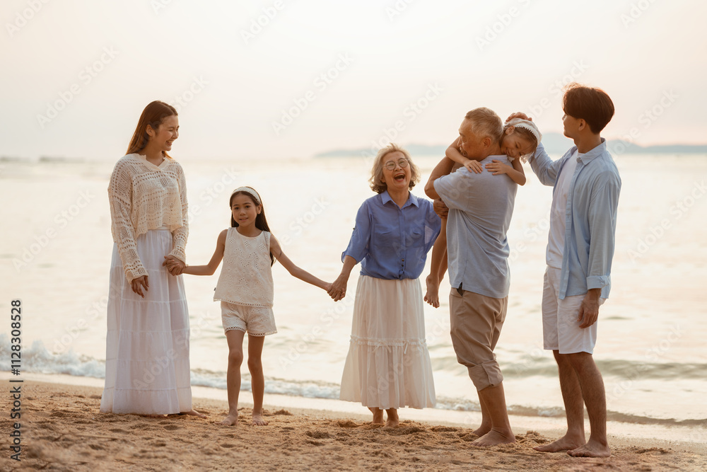 family, parents, parent, partnership, children, child, dad, elderly, father, community. A family of five is standing on the beach. The family appears to be enjoying their time together.