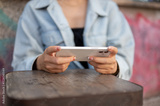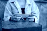 A close-up of a woman sits at an outdoor table of a cafe, using her smartphone, watching a video.