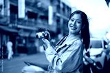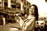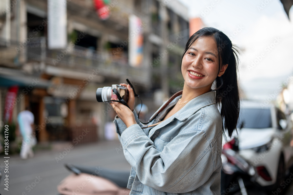 A happy Asian female tourist enjoying taking photos while exploring the city, smiling at the camera.