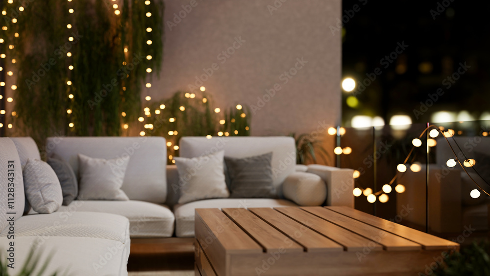 A cozy, beautiful apartment balcony at night, featuring a comfortable couch and glowing lights.