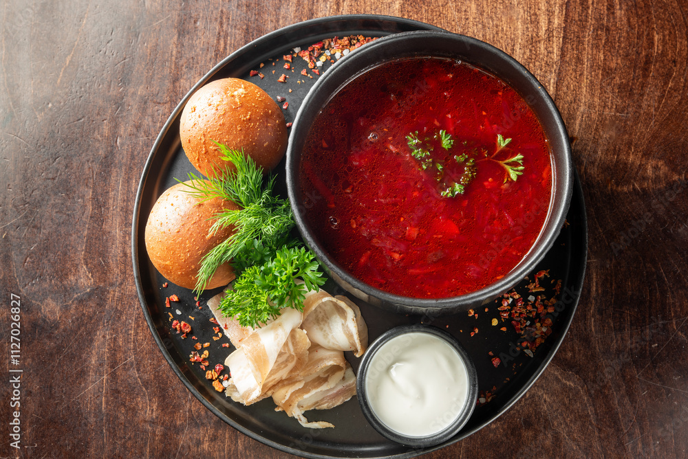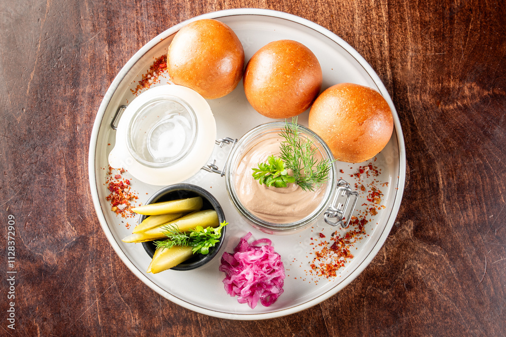 A gourmet dish featuring a jar of creamy pâté garnished with fresh herbs, accompanied by soft bread rolls, pickled vegetables, and colorful salad on a wooden table. Ideal for food-related projects.